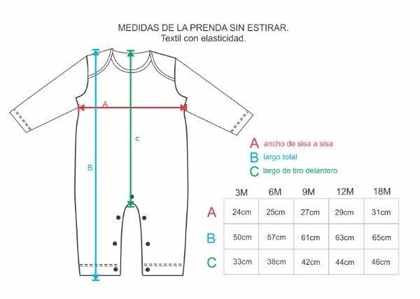 Cuello americano y broches en piernas para rápido cambio de pañal sin pasar frío.